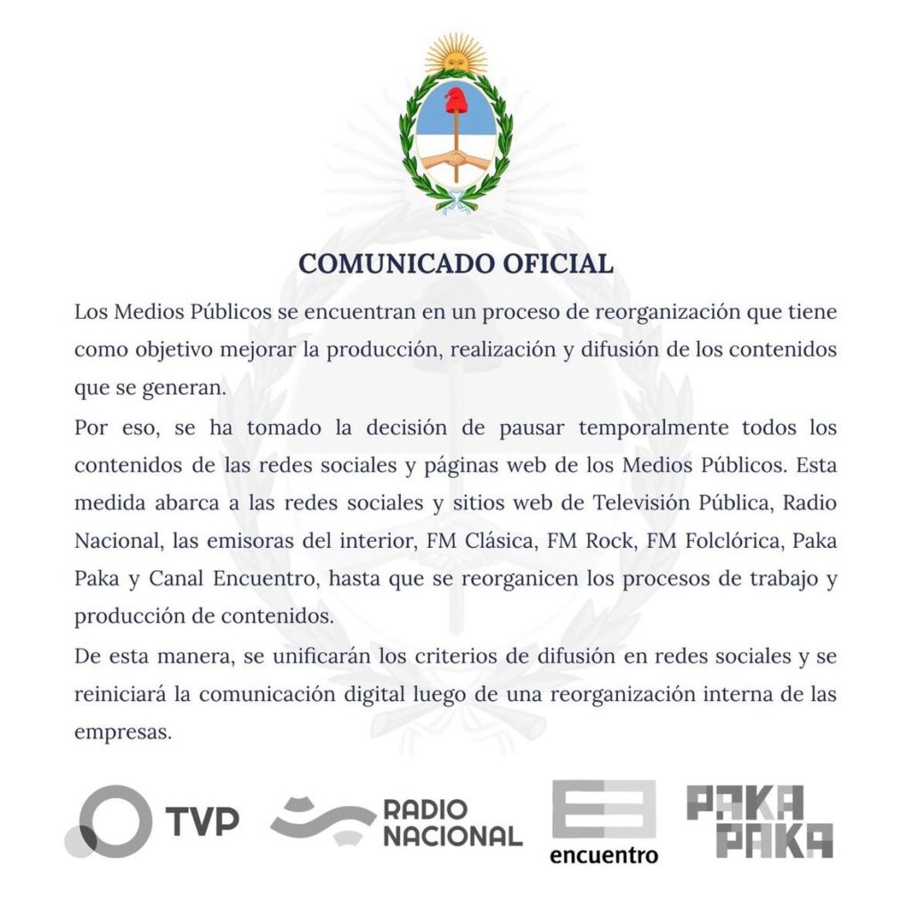 El comunicado oficial se compartió en las redes sociales de los medios públicos, donde se explicó que la medida busca mejorar la producción, realización y difusión de los contenidos generados por los Medios Públicos. Esta decisión abarca a las redes sociales y sitios web de Televisión Pública, Radio Nacional, las emisoras del interior, FM Clásica, FM Rock, FM Folclórica, Paka Paka y Canal Encuentro, y se restablecerá la comunicación digital después de una reorganización interna de las empresas.