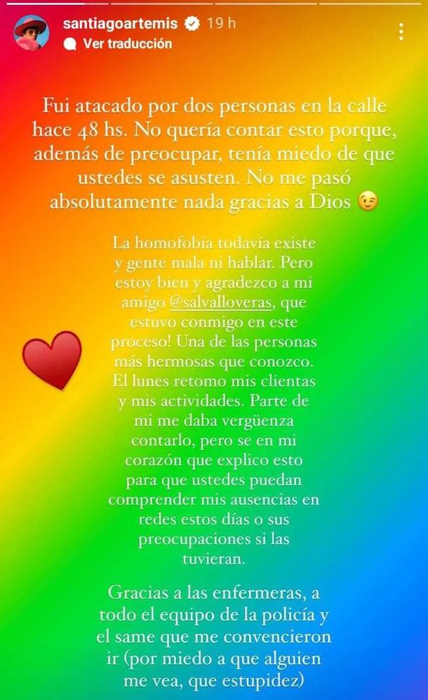 «Fui atacado por dos personas en la calle hace 48 horas. No quería contar esto porque, además de preocupar, tenía miedo de que ustedes se asusten. No me pasó absolutamente nada, gracias a Dios», explicó Artemis en sus redes sociales.