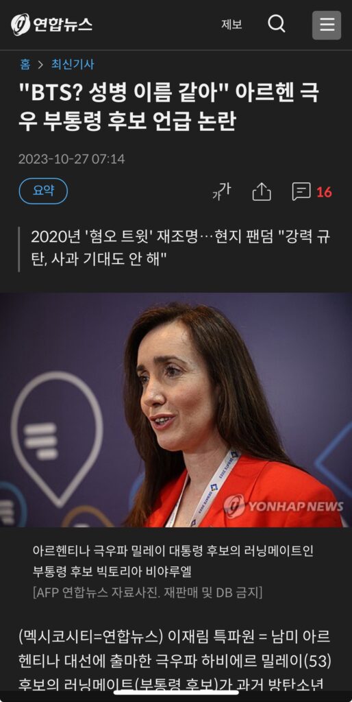 Estos comentarios desataron la ira de los fanáticos locales de BTS en Argentina, pero también llegaron a Corea del Sur, donde los medios de comunicación y portales web informaron sobre las declaraciones de la candidata argentina. La prensa coreana se refirió a ella como «ultra derecha» debido a sus opiniones y resaltó la internacionalización de las elecciones argentinas y los nombres polémicos de los candidatos de La Libertad Avanza.