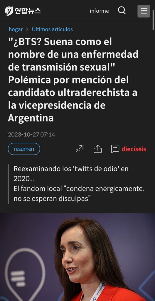 En particular, el medio coreano Yonhap News Agency cubrió este conflicto y se refirió a las publicaciones ofensivas de Villarruel hacia BTS. Se mencionó que estos comentarios generaron controversia y descontento entre los fanáticos de BTS y que los mensajes reflejaban actitudes xenofóbicas hacia el grupo surcoreano.
