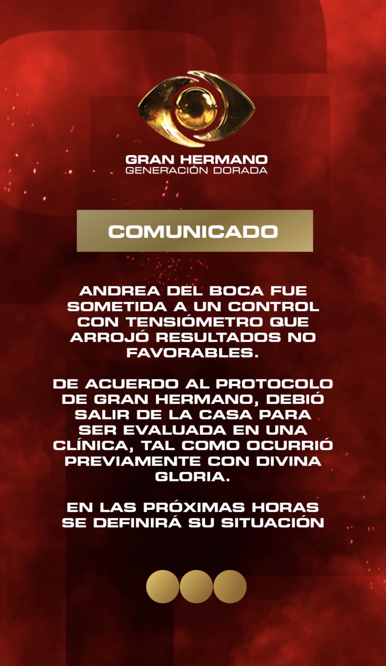 De acuerdo a lo establecido por la producción del reality, Del Boca debió abandonar momentáneamente la casa para ser trasladada a una clínica, donde se le realizarán estudios más completos. Se trata de un procedimiento habitual en el ciclo cuando se presentan situaciones de este tipo, tal como ya había ocurrido anteriormente con otra participante.