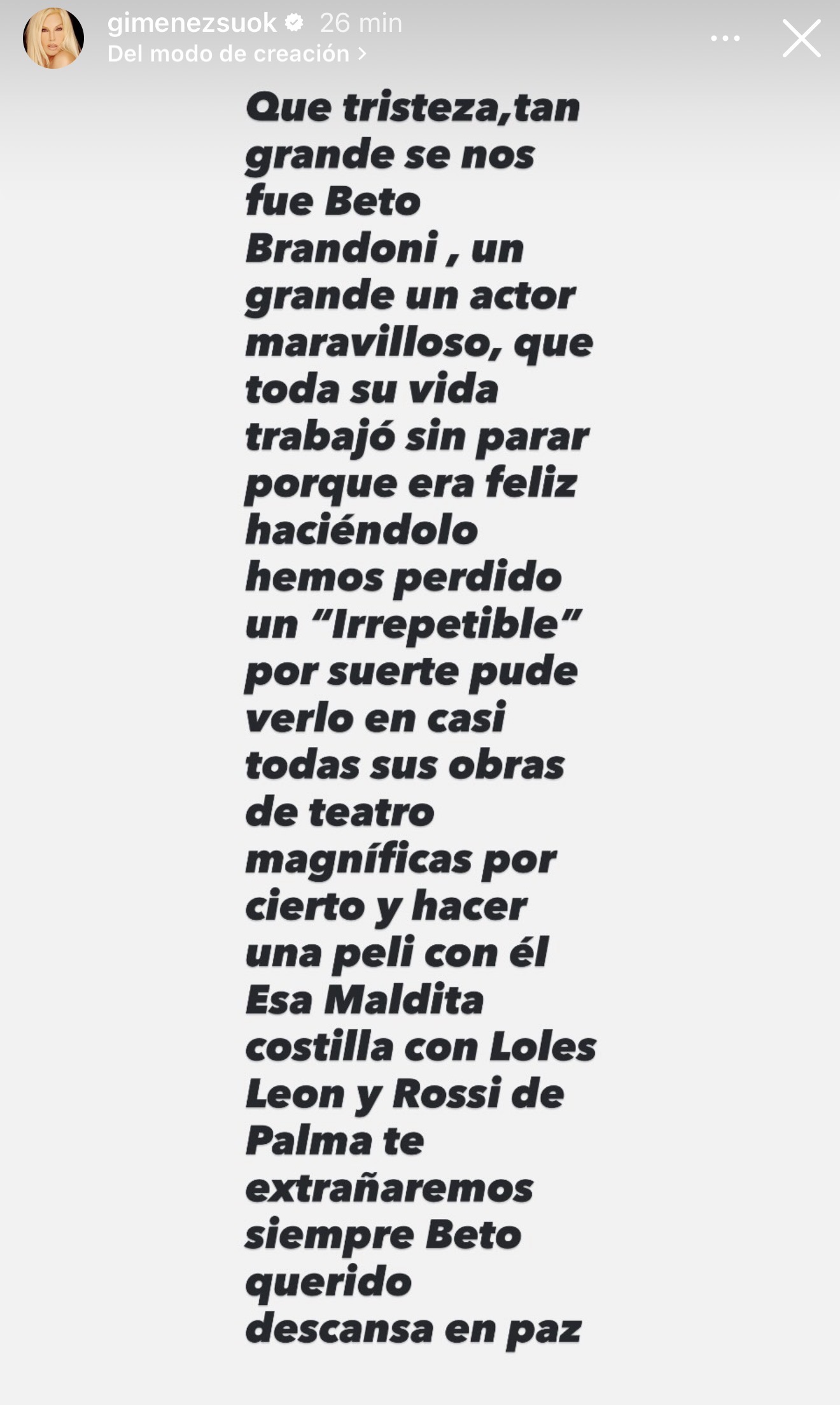 “Qué tristeza tan grande, se nos fue Beto Brandoni, un grande, un actor maravilloso, que toda su vida trabajó sin parar porque era feliz haciéndolo”, escribió Susana en una historia de Instagram.