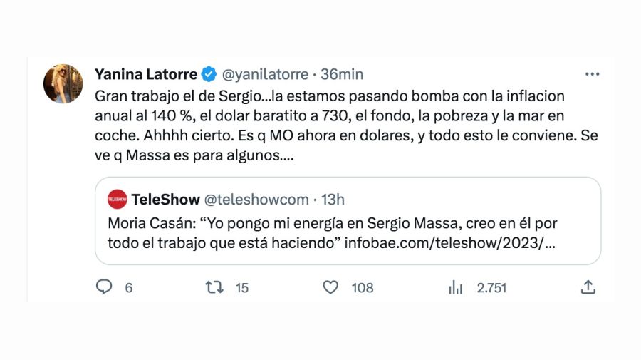 Sin embargo, la opinión de Casán no fue compartida por todos. Yanina Latorre respondió en Twitter a los comentarios de Casán, cuestionando la efectividad de las medidas económicas y señalando la alta inflación y la subida del dólar. Latorre expresó su desacuerdo con las afirmaciones de Casán y mencionó varias problemáticas económicas que enfrenta el país.