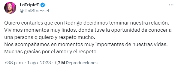 El futbolista tambien compartió un mensaje a través de su cuenta de Twitter, donde expresó: «Quiero contarles que con Tini decidimos terminar nuestra relación. Vivimos momentos muy lindos, donde tuve la oportunidad de conocer a una persona que quiero y respeto mucho. Nos acompañamos en momentos muy importantes de nuestras vidas. Muchas gracias por el amor y el respeto».