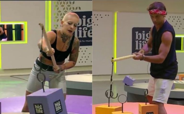 La prueba de esa semana consistía en mantener el equilibrio: los dos jugadores estaban sobre plataformas inestables y debían usar una caña para pescar bloques de sus respectivos colores, ubicados en una plataforma giratoria, y luego insertarlos en las ranuras de sus mesas respectivas.