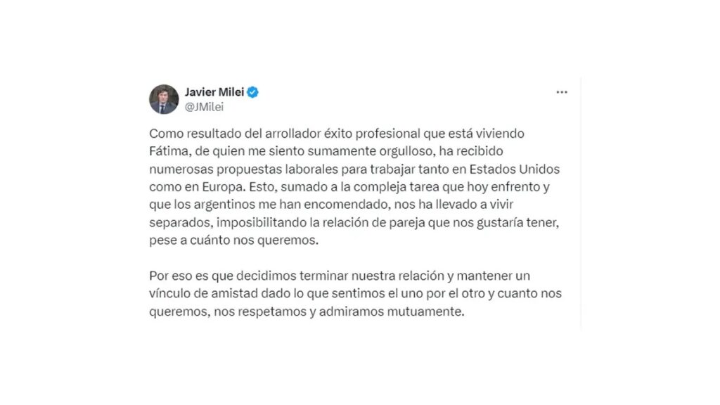 Javier Milei anunció su separación de Fátima Flórez debido a motivos profesionales. La decisión fue comunicada por el mandatario a través de su cuenta de X, donde expresó que ambos se quieren, respetan y admiran mutuamente.