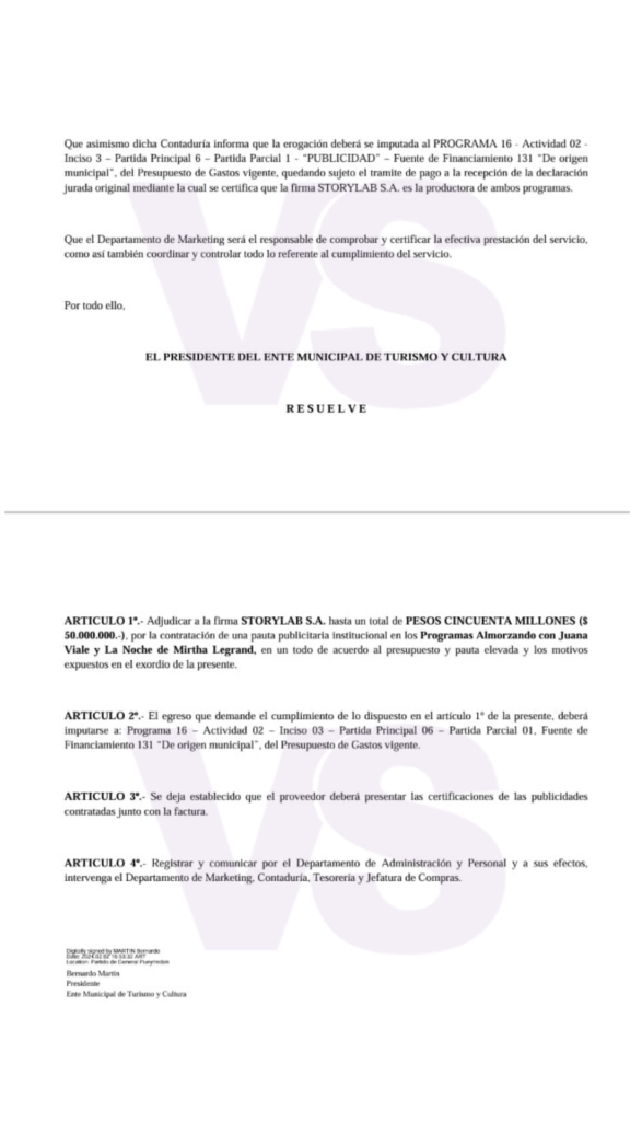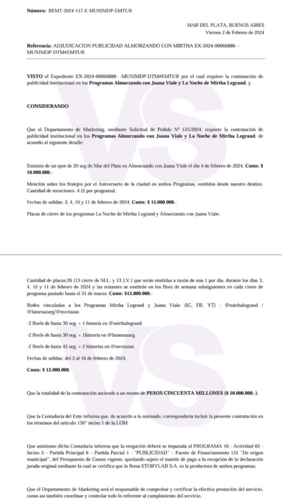 - Emisión de spot publicitario: Se destinaron 10 millones de pesos para la emisión de un spot de 20 segundos de Mar del Plata en el programa de Juana Viale el 4 de febrero de 2024.