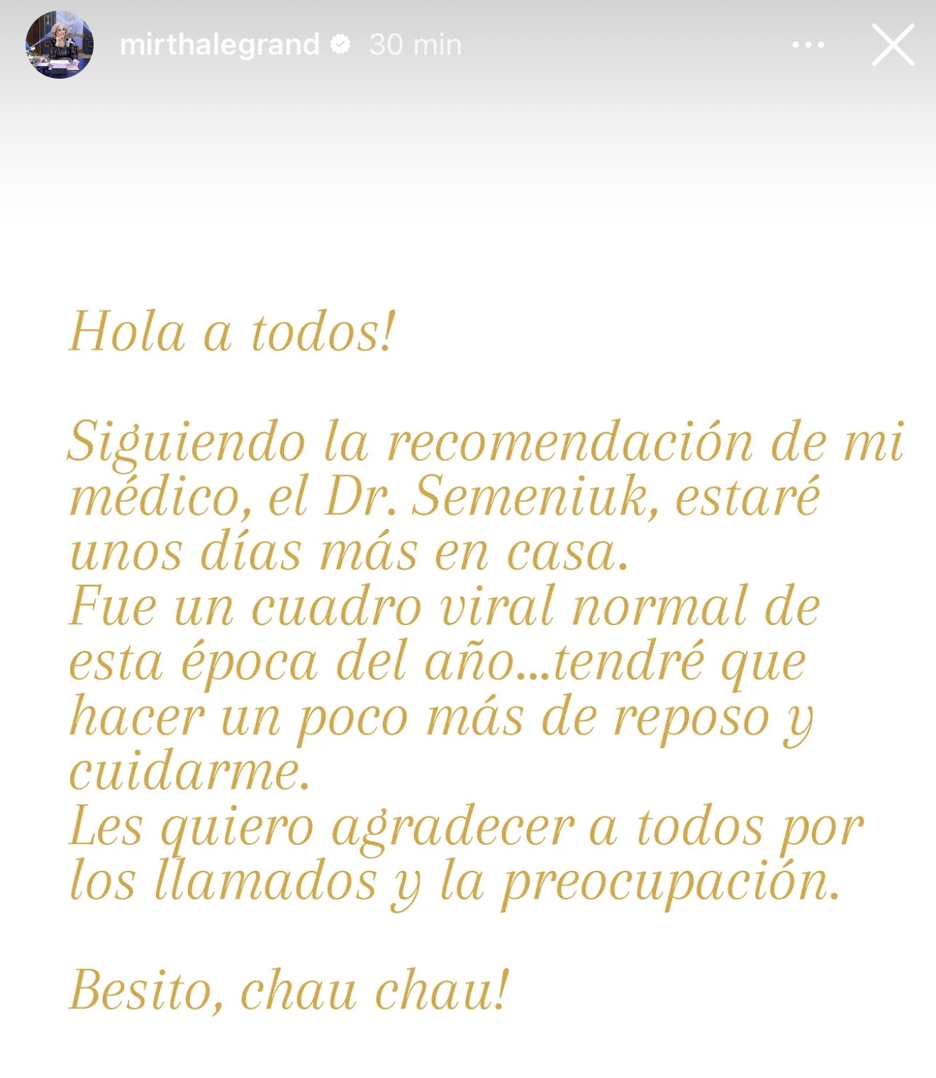 Mirtha Legrand llevó tranquilidad a sus seguidores luego de varios días de preocupación por su estado de salud. A través de una historia en su cuenta oficial de Instagram, la conductora explicó que seguirá unos días más en su casa por recomendación médica.
