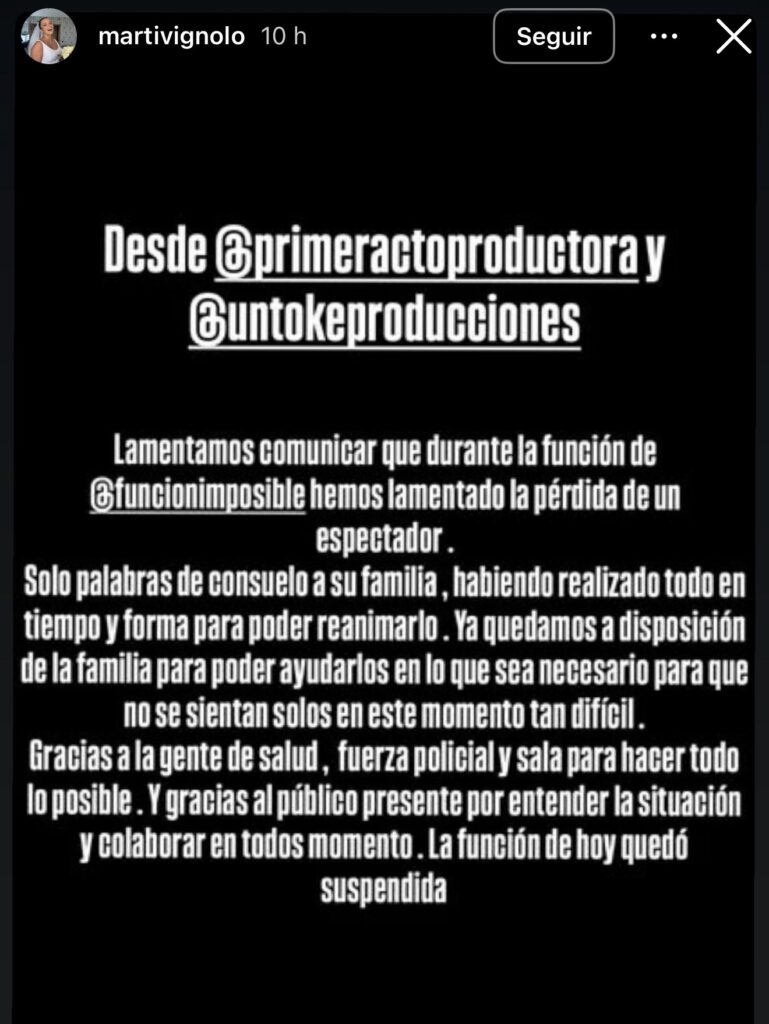 Desde la producción del espectáculo, a cargo de Primer Acto Productora y Juntoke Producciones, emitieron un comunicado en el que señalaron: “Lamentamos comunicar que durante la función de @funcionimposible hemos lamentado la pérdida de un espectador. Solo palabras de consuelo a su familia, habiendo realizado todo en tiempo y forma para poder reanimarlo”.
