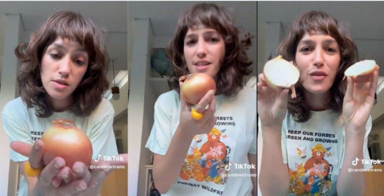 Cande Vetrano grabó un video en el que detalló un método poco convencional para cortar cebollas sin llorar.