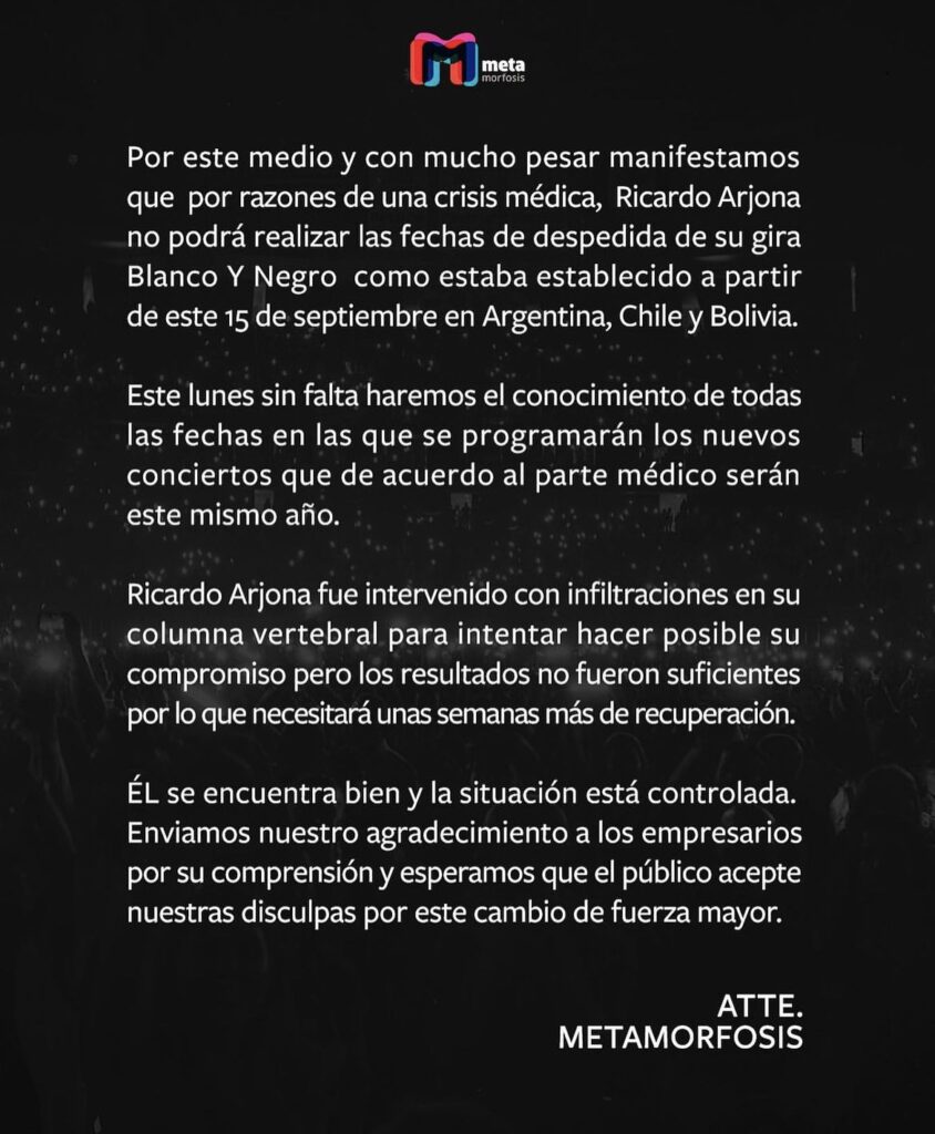 La noticia fue confirmada por la producción de Ricardo Arjona a través de un comunicado emitido el pasado sábado. En el comunicado se lee: «Por este medio y con mucho pesar manifestamos que por razones de una crisis médica, Ricardo Arjona no podrá realizar las fechas de despedida de su gira Blanco Y Negro como estaba establecido a partir de este 15 de septiembre en Argentina, Chile y Bolivia».
