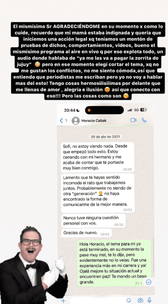 La polémica entre Sofía Jujuy Jiménez y Horacio Cabak resurge con fuerza luego de que la modelo expusiera chats privados que revelan un episodio poco conocido tras su renuncia al programa «Informados de todo» en 2021.