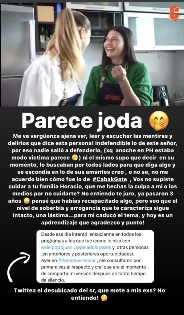 La modelo arremete contra Cabak, cuestionando su capacidad para cuidar a su familia y destacando su falta de autocrítica. En un giro inesperado, Jujuy comparte un chat privado del 2021 en el que Cabak agradece su comportamiento durante el tiempo que trabajaron juntos, expresando arrepentimiento por cualquier incomodidad generada.